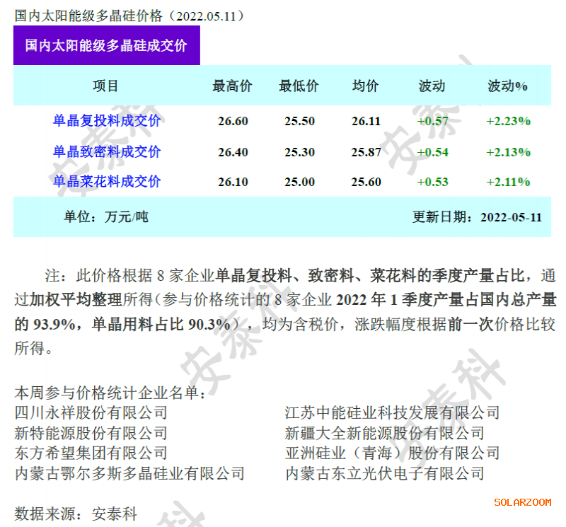 本周国内多晶硅价格维持涨势,其中单晶复投料、单晶致密料、单晶菜花料成交均价涨幅在2%左右。本周各硅料企业5月份订单基本签订完毕,包括上周签订的长单和本周部分散单,长单主流价格在25.8-26.2万元/吨,散单价格区间在26.3-26.6万元/吨,散单价格较长单价格高出0.4-0.5万元/吨,间接表明硅料的紧缺程度有增无减。近期硅料价格上涨动力主要体现在供应增量不及需求增量:硅片企业包括高景、双良、京运通等大幅增量产能陆续具备投产条件,在硅片利润水平相对较高的情况下,新老企业开工率上调的意愿均较为强烈,导致硅料需求量大幅增加,但同期硅料企业包括协鑫、通威、新特、亚硅等扩产企业均不同程度受到疫情运输不畅的影响,扩产增量不及预期,因此导致近期硅料企业无论是在执行原有订单方面,还是满足新增产能需求方面,均略感力所不能及,因此硅料市场供应紧缺状态持续,价格依旧维持涨势。