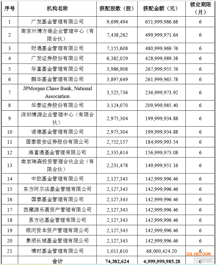 5月11日,晶澳科技发布非公开发行A股股票之发行情况报告书暨上市公告书,确定此次发行价为67.22元/股,发行数量为7438.2624万股,募集资金总额约50亿元。募集资金扣除发行费用后将全部用于年产20GW单晶硅棒和20GW单晶硅片项目、高效太阳能电池研发中试项目和补充流动资金。