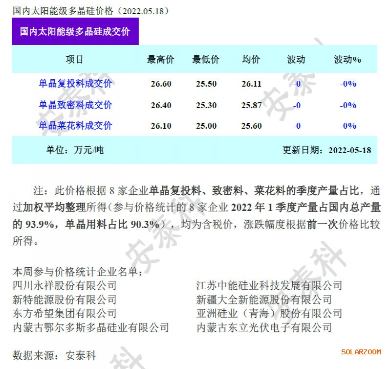 本周国内多晶硅价格持稳不变,主要是由于截止上周各硅料企业5月份订单几乎全部签订完毕,本周绝大多数企业无新订单成交,只有1-2家企业以上周价格签订极少量散单,故本周硅料均价持稳不变。目前多晶硅市场现状是:硅料紧缺现状持续,价格阶段性持稳。国内硅料企业包括现有在产企业和新进企业,都不同程度受到疫情影响,扩产产能虽增速放缓,但增量正逐月释放,但是即便如此,仍不及需求增量,部分具备投产条件的硅片产能因硅料不足无法提高产出,甚至部分一线硅片企业也因硅料不足有被迫降低开工率的可能,可见硅料紧缺的现状依旧持续。本周硅料价格持稳,主要原因是各多晶硅企业订单都已签订完毕,甚至有部分硅料交货期已至6月中旬,各企业无料可签;其次是由于近期硅片结构性库存未见减少,高价抢购散单的情况有所缓解。因此本周硅料市场价格呈现阶段性持稳态势。