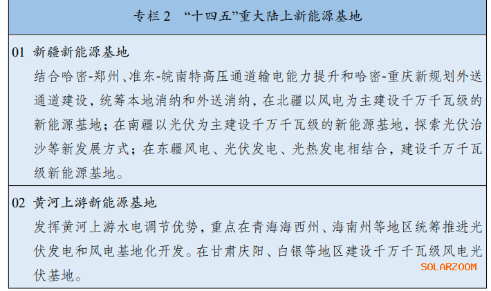 加快推进以沙漠、戈壁、荒漠地区为重点的大型风电太阳能发 电基地。以风光资源为依托、以区域电网为支撑、以输电通道为牵 引、以高效消纳为目标,统筹优化风电光伏布局和支撑调节电源