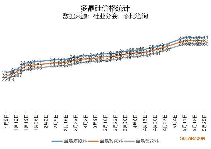 5月25日,中国有色金属工业协会硅业分会公布了多晶硅最新价格,国内多晶硅均价持稳不变,目前硅料市场依旧供应紧缺,价格涨势仍在,但本周价格持稳,主要是由于阶段性硅料超签,无料可供,无主流成交则市场价格呈阶段性持稳态势,现阶段多晶硅企业基本无库存甚至库存为负数,产量主要满足长单交货。