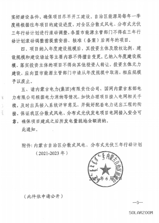 3)在当年建设计划规模内的分散式风电、分布式光伏发电项目必须于当年核准、备案并开工建设,分散式风电项目必须于次年12月底建成并网,分布式光伏发电项目必须于次年6月底建成并网,对于未按规定时间并网的项目,各盟市能源主管部门应及时予以废止。