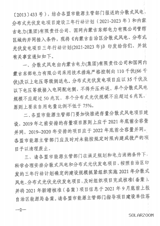 根据内蒙古自治区分散式风电、分布式光伏发电项目三年行动计划(2021-2023年)显示:分散式风电由内蒙古电力(集团)有限责任公司和国网内蒙古东部电力有限公司采用技术措施严格控制向110千伏(66千伏)及以上电压等级侧送电。分布式光伏发电项目应以35千优及以下电压等级接入电网配电侧,不得升压外送。单个分散式风电规模不应超过50兆瓦,单个分布式光伏规模不应超过6兆瓦,原则上要求自用电量比例不低于75%。