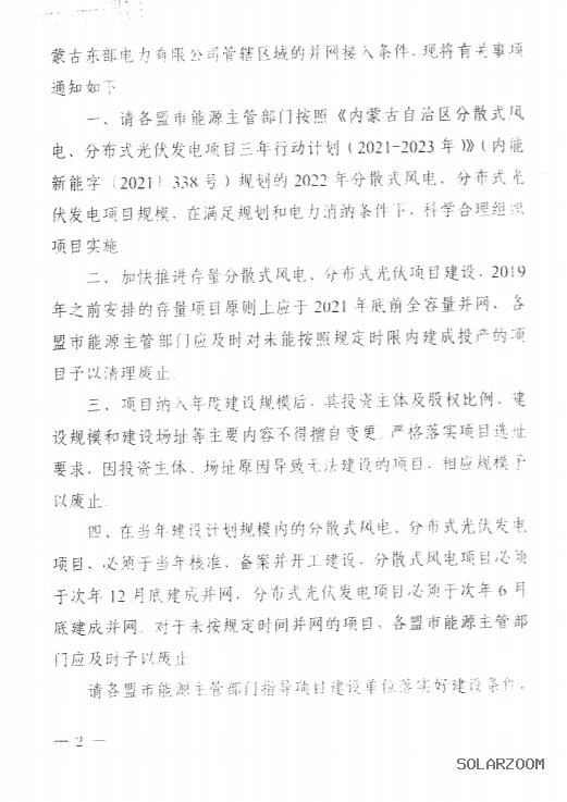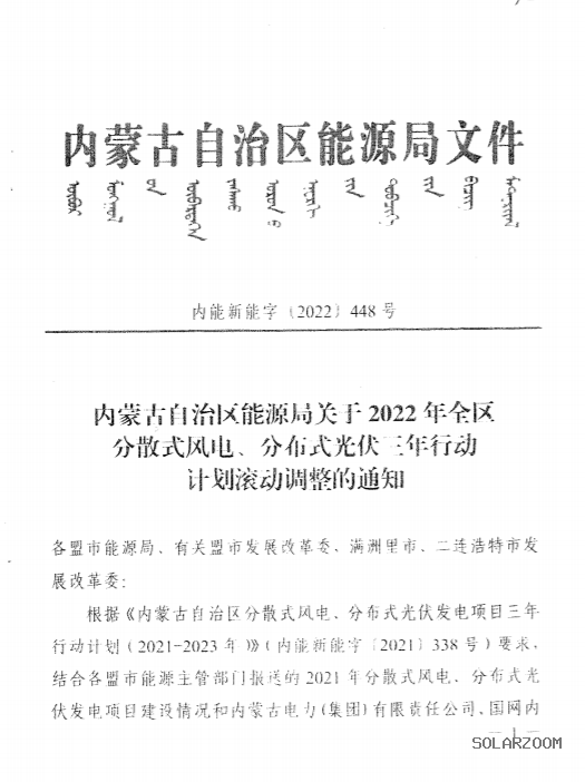 近日,内蒙古自治区能源局发布《关于2022年全区分散式风电、分布式光伏三年行动计划滚动调整的通知》,提出: