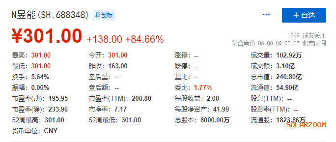 6月8日,昱能科技股份有限公司(简称“昱能科技”,代码“688348”)正式登陆上海证券交易所科创板,发行总股数2000万股,每股发行价163元/股。上市当日,公司股价开盘报301.00元,较发行价上涨84.66%,市值突破240亿。