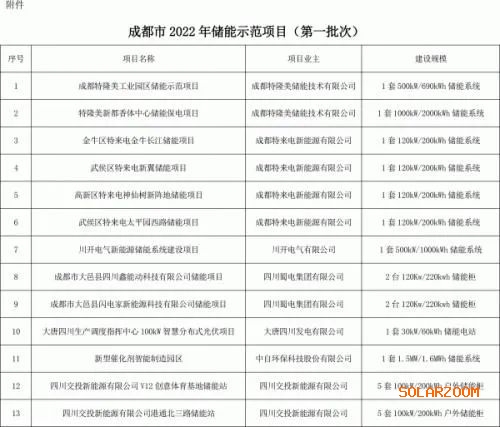 日前,成都市发改委发布公示信息,共有13个储能示范项目被纳入成都市2022年第一批次储能示范项目名单。