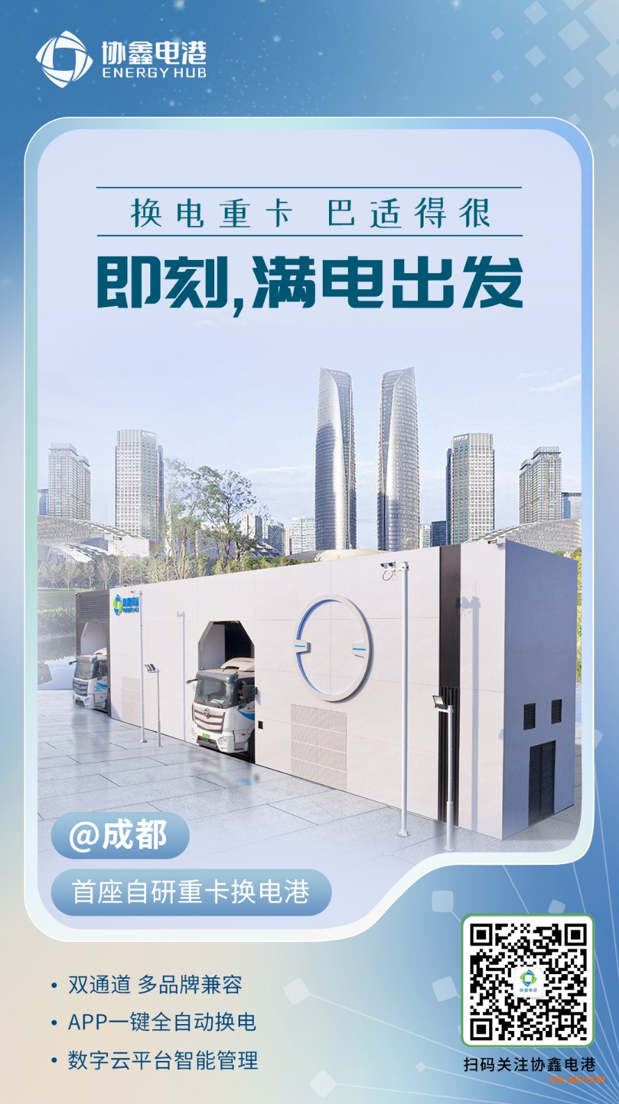 这座自研重卡换电港位于成都市双流区,占地仅80平米,集装箱式的设计极富工业感和科技感,银灰色的外立面嵌有一蓝色能源环,彰显着低碳环保的理念。换电港可兼容吉利、三一、徐工、福田、东风、重汽王牌等多品牌牵引车、自卸车、搅拌车、环卫车,覆盖近20款车型。换电港配置两套换电机构,10个电池仓位,可同时为2辆重卡换电,免去排队等候;一键扫码实现全自动换电,单次换电时长最短不到140秒,单日最大换电服务能力达240次。“协鑫电港的标准电池包具备一包多车的属性,未来3年可覆盖80%以上商用车。”协鑫(集团)控股有限公司西南总部执行总裁王晨明介绍说。