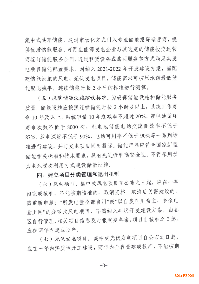规范储能设施建设标准。为确保储能设施和储能服务质量,储能设施应按照连续储能时长2小时及以上,系统工作寿命10年及以上,系统容量10年衰减率不超过20%,锂电池循环寿命次数不低于8000次,锂电池储能电站交流侧效率不低于87%、放电深度不低于90%、电站可用率不低于90%等一系列标准进行建设,并与发电项目同时投运。储能产品应符合国家新型储能相关标准和技术要求,具有先进性和高安全性。不得采用动力电池梯次利用方式建设储能设施。