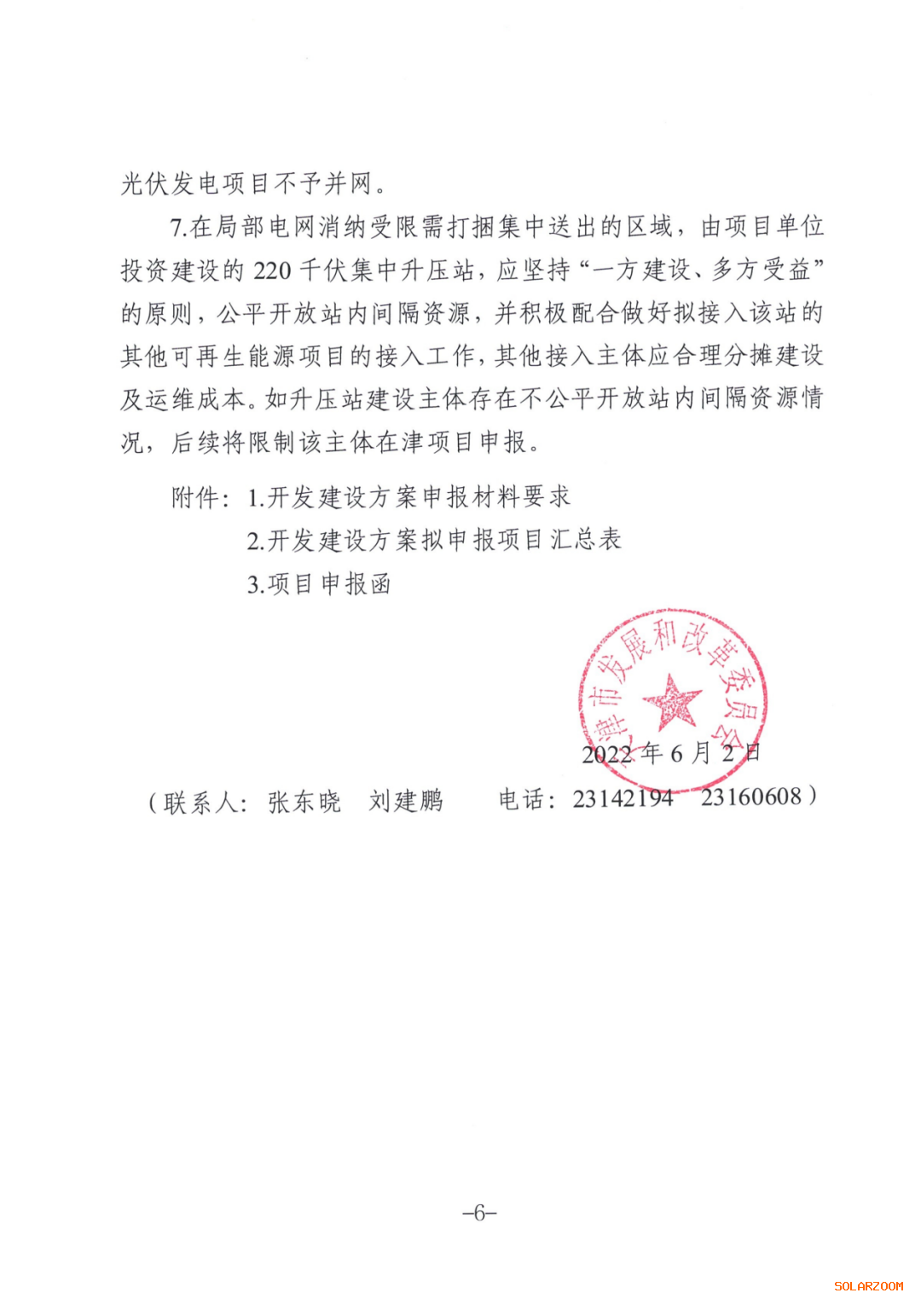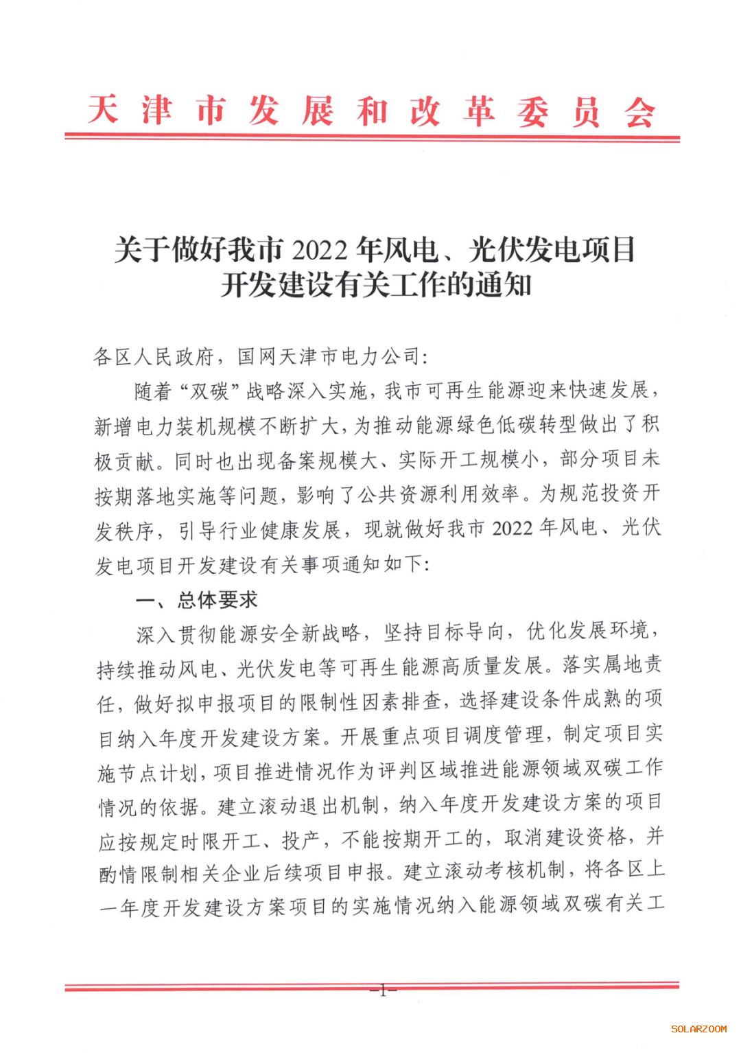 6月2日,天津市印发了《关于做好我市2022年风电、光伏发电项目开发建设有关工作》的通知。要求做好2022年开发建设方案项目申报,各区组织符合条件、有投资意愿的企业开展年度开发建设方案项目申报,并组织有关部门做好限制性因素排查。在确保项目申报材料真实准确、建设场址不重叠的基础上,将申报材料进行整理、汇总,于7月10日17:00前上报市发改委。
