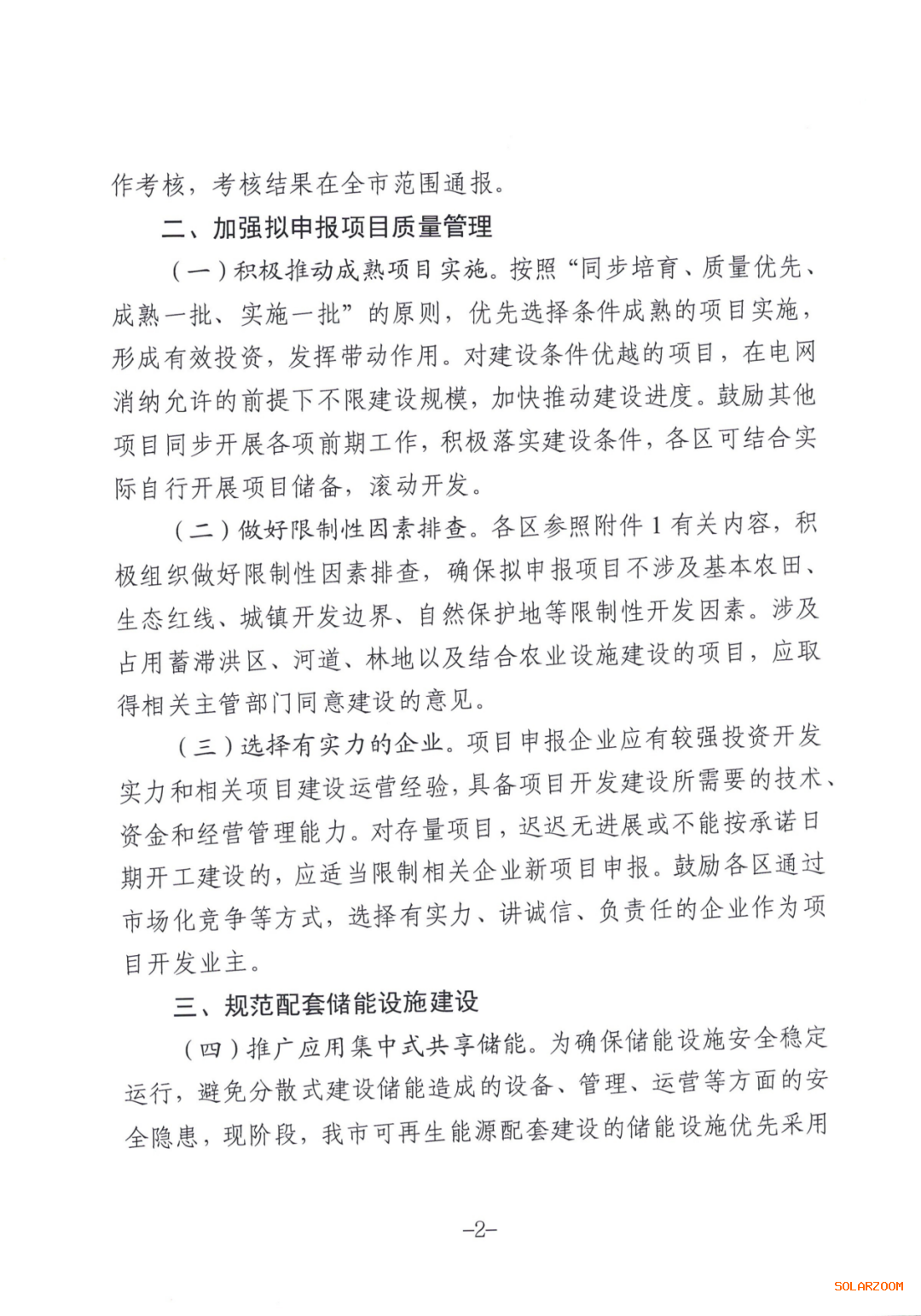 文件要求,加强拟申报项目质量管理,推动成熟项目实施、好限制性因素排查、选择有实力的企业。同时规范项目的配套储能设施建设,推广应用集中式共享储能。可通过市场化方式引入专业储能投资运营商,提供优质储能服务。可再生能源发电企业与其选定的储能投资运营商签订储能服务合同,通过租赁设备或购买服务等方式满足其发电项目储能配置要求。