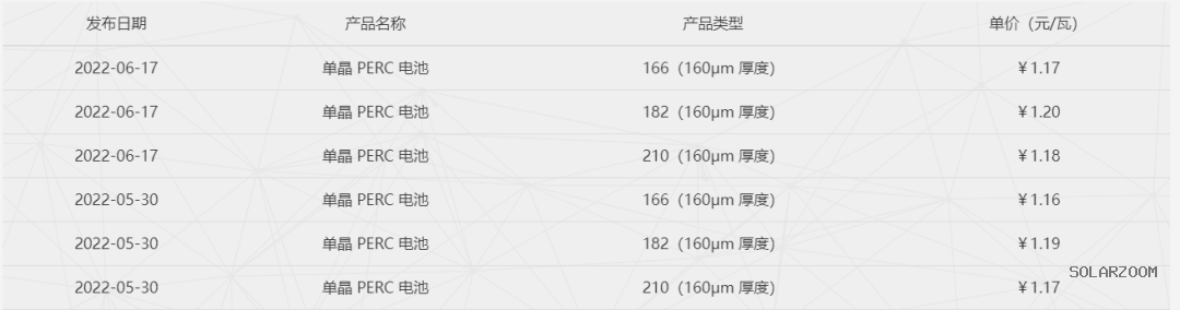 6月17日晚间,通威官网公布最新电池片报价,所有规格电池片报价集体上涨0.01元。