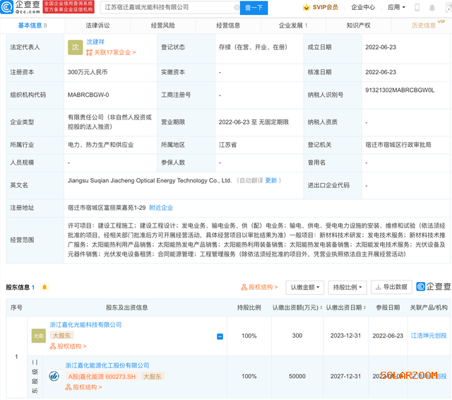 企查查APP显示,6月23日,江苏宿迁嘉城光能科技有限公司成立,法定代表人为沈建祥,注册资本300万元人民币,经营范围包含:新材料技术研发;太阳能热发电装备销售;太阳能发电技术服务;光伏设备及元器件销售等。企查查股权穿透显示,该公司由嘉化能源(600273)间接全资控股。