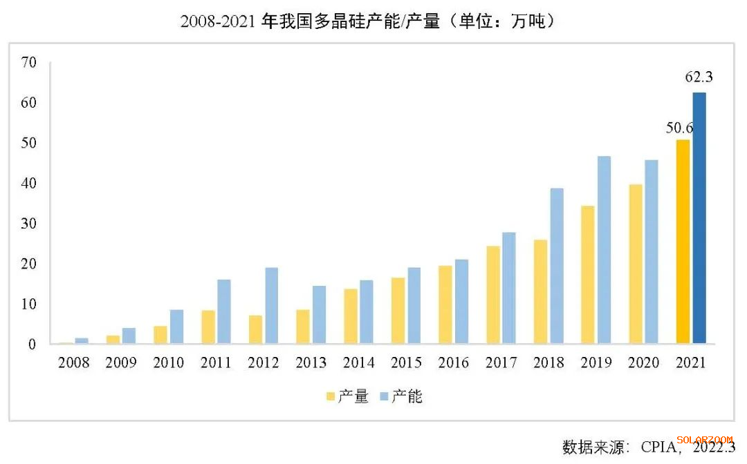 作为晶硅光伏产业重镇的四川,2021年,全国多晶硅产量约50万吨,占全球产量的七成以上,四川多晶硅产量则约占全国产量的13%。随着本轮光伏产业“赛跑”鸣枪,全球多晶硅光伏领域头部企业纷纷起跑入局,已有5家通过直接或参股方式“落户”乐山,同时伴随地方政策的不断推动。预计未来两年,全国多晶硅产能约有一半出自四川乐山,筑梦“中国绿色硅谷”终成真。