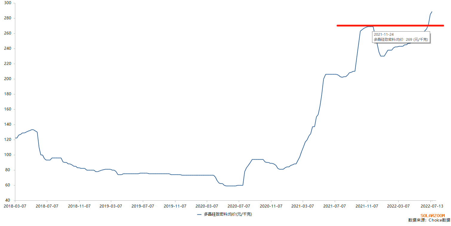 数据显示,多晶硅价格自2021年进入上升通道后,在经历了去年年底的阶段调整,今年价格持续走高。至今,多晶硅致密料价格已突破2021年11月价格高点26.9万元/吨。