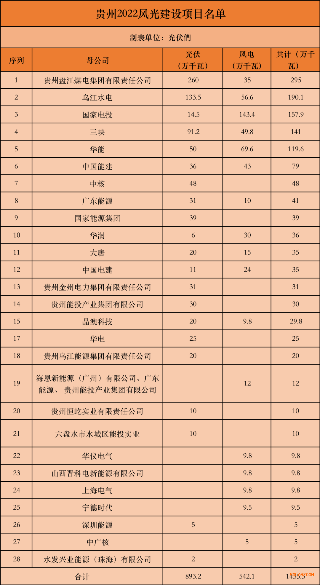 根据光伏們统计,在此次光伏项目建设名单中,贵州盘江煤电集团、乌江水电、三峡集团分别以260万千瓦、133.5万千瓦、92.1万千瓦位居前三。其中贵州盘江煤电集团有限责任公司是从属于贵州省国资委的国有控股公司,贵州乌江水电是由中国华电集团有限公司(51%)和贵州乌江能源投资有限公司(49%)联合控股的子公司。