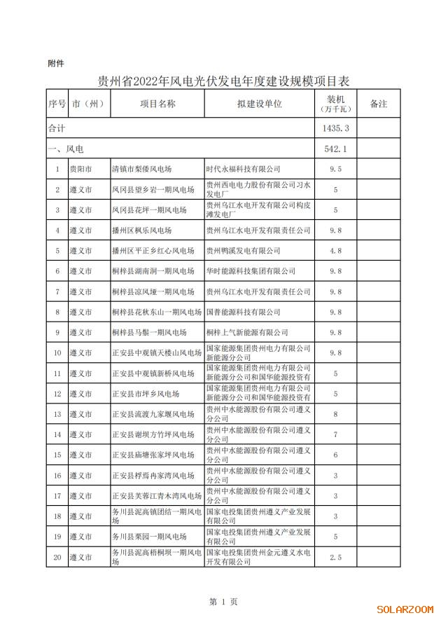 为推进我省新能源产业健康有序发展,根据《贵州省风电光伏发电项目管理暂行办法》《省能源局关于进一步加强新能源项目管理有关工作的通知》有关要求,经研究同意,制定了我省2022年风电光伏发电年度建设规模,总装机1435.3万千瓦,其中风电542.1万千瓦,光伏发电893.2万千瓦。拟接入贵州电网1295.3万千瓦,接入万峰电力地方电网140万千瓦。现予以下达。