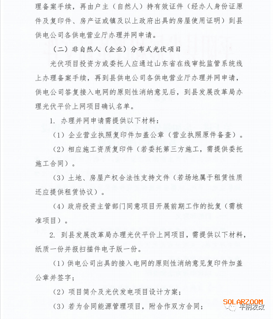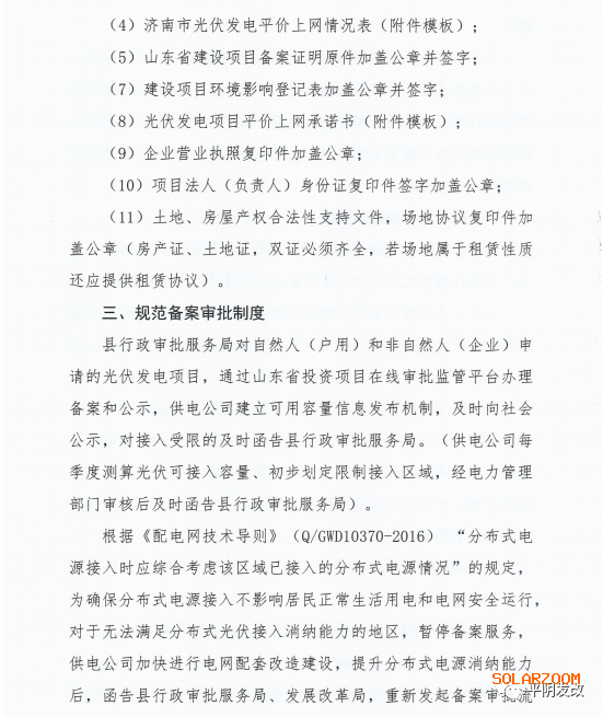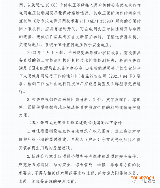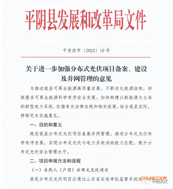 日前,山东省济南市平阴县发改局印发《关于进一步加强分布式光伏项目备案、建设及并网管理的意见》,文件提出分布式光伏应就地就近消纳。原则上各类光伏总计开发规模不应超过本区域全年最大用电负荷60%,避免向220千伏及以上电网反送电。根据就地就近消纳要求,原则上分布式光伏电力在接入电压等级及以下电网范围内消纳。