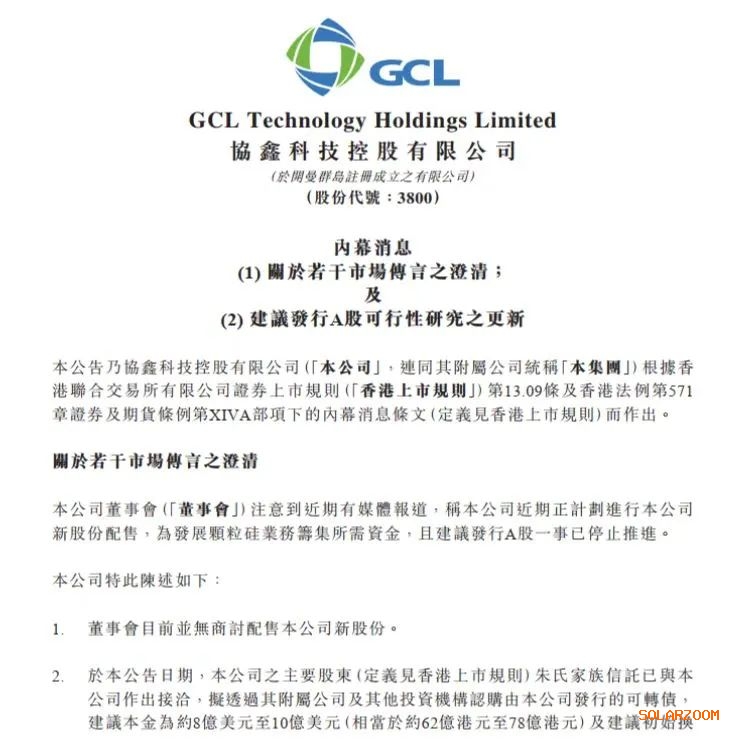8月15日晚,协鑫科技(03800.HK)发布公告,对近期有关公司拟配售新股以及停止发行A股计划的传言进行澄清。