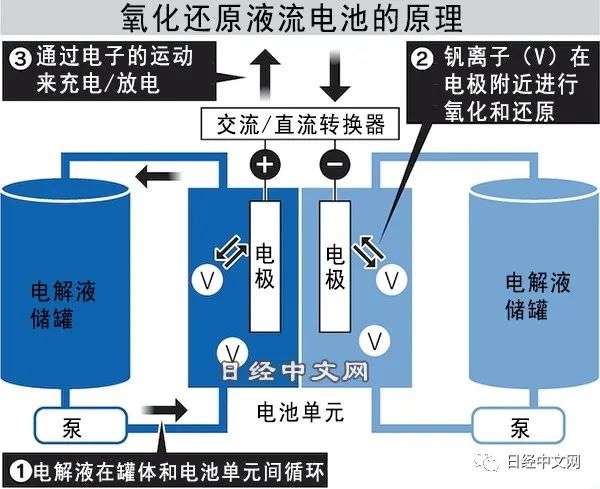 氧化还原液流电池的工作原理是,利用泵使储存在罐体中的电解液循环,由稀有金属钒的离子进行蓄电和放电。也就是所谓的“全液体型”电池。最大的优点是耐用年限长,达到20年以上,而纯电动汽车(EV)等使用的主流锂电池被认为只能使用10年左右。