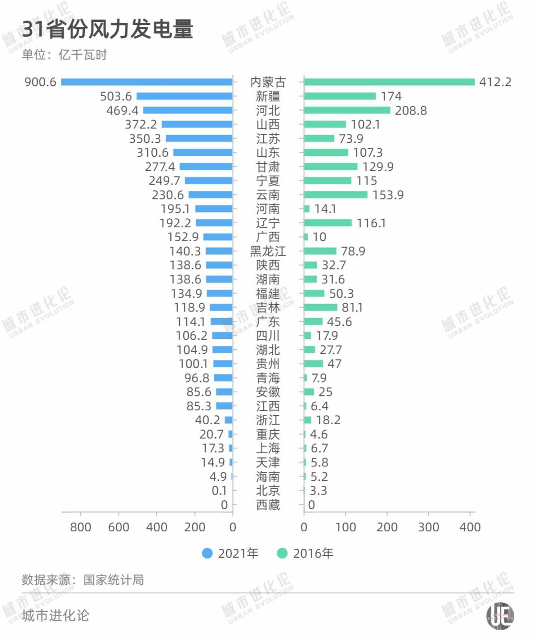 2021年,风力发电量前10名省份中,有8个都来自“三北”地区,内蒙古、新疆及河北分别位列前三。