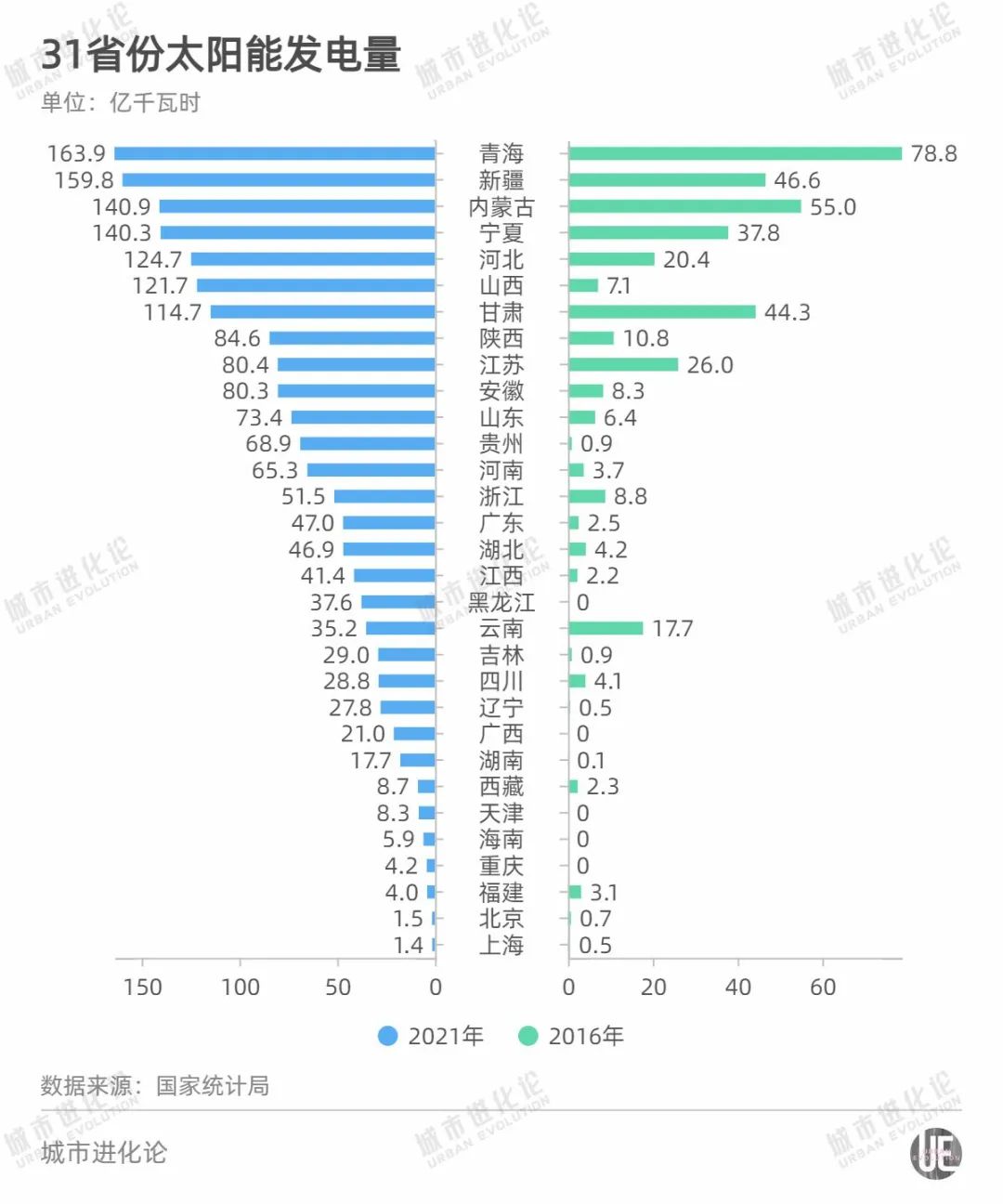 同年,太阳能发电量的前八名无一例外均被三北地区省份包揽,除青海居于第一外,新疆、内蒙古再次进入前三。