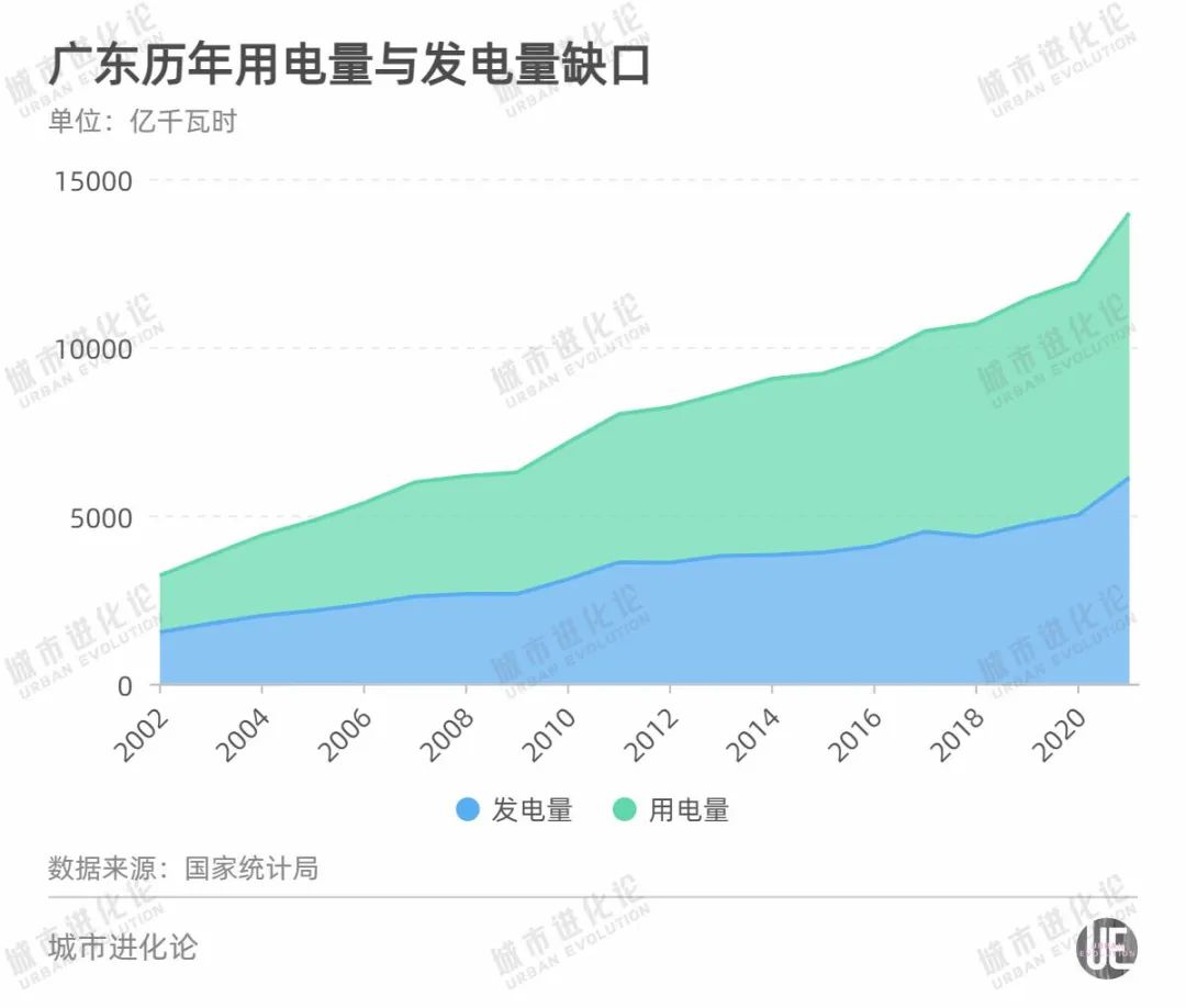 数据显示,2002年,广东的发电量全国第一,为1525.5亿千瓦时,与云贵川三省发电量总和(1616亿千瓦时)相差不大;到了2021年,广东以6115.2亿千瓦时发电量排名全国第一,而云贵川三省发电量已增至10002.8亿千瓦时。