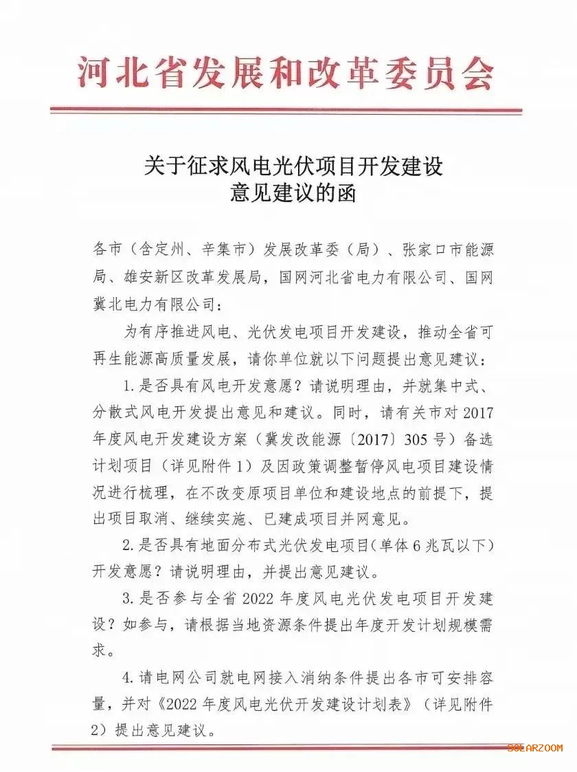 在征求意见函中,河北省发改委要求各地主管部门就风电、地面分布式光伏开发意愿进行说明,并请电网公司就电网接入消纳条件提出各市可安排容量,并对《2022年度风电光伏开发建设计划表》提出意见建议。