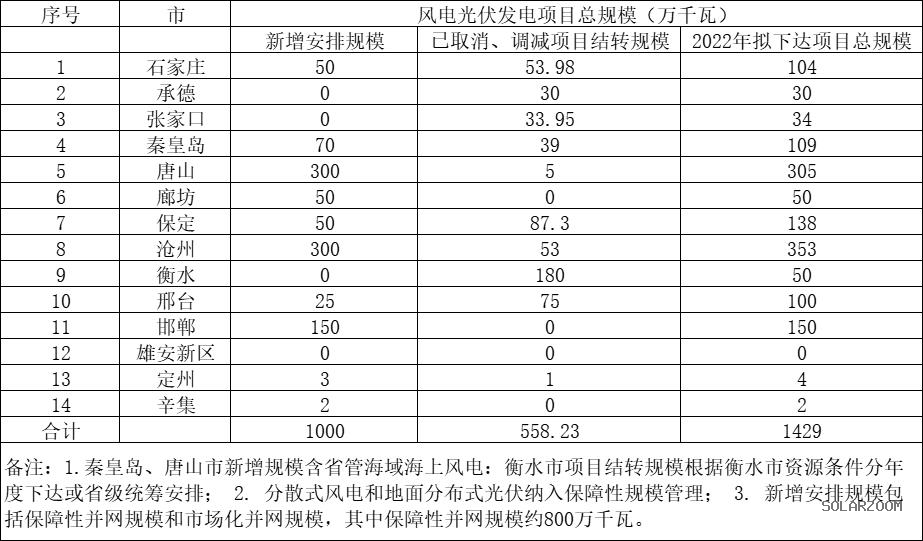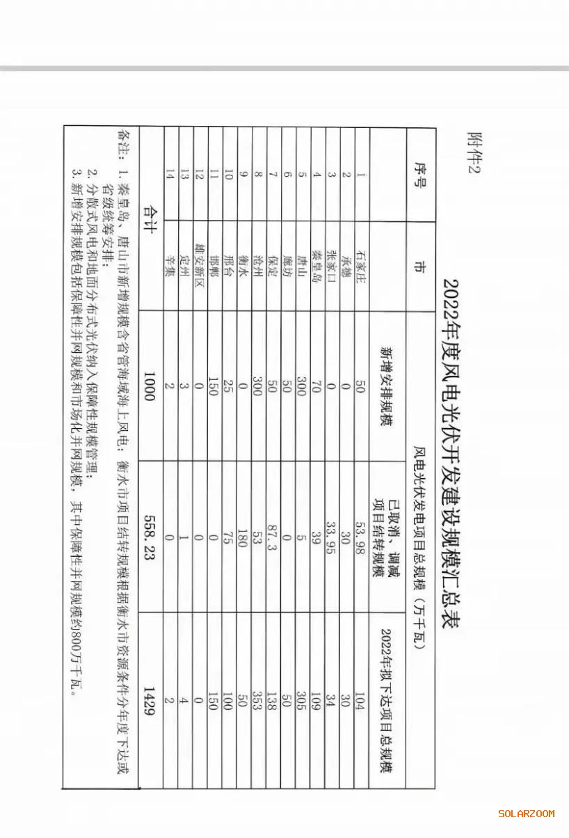 根据公示的2022年风光开发建设规模表,河北省2022年拟下达风光项目14.29GW,分布在石家庄、承德、张家口、秦皇岛等14个市。其中,已取消、调减项目结转规模5.58GW,新增规模规模为10GW。