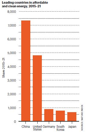 自然指数(Nature Index)数据显示,2015-2021年,中国的SDG7相关研究产出位居全球第一,紧随其后的是美国、德国、韩国和日本。