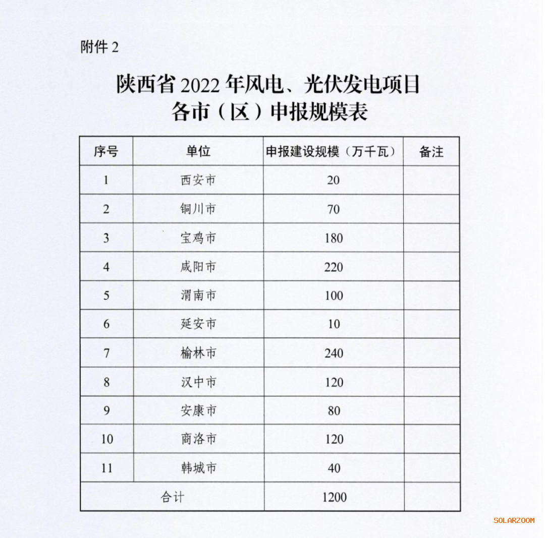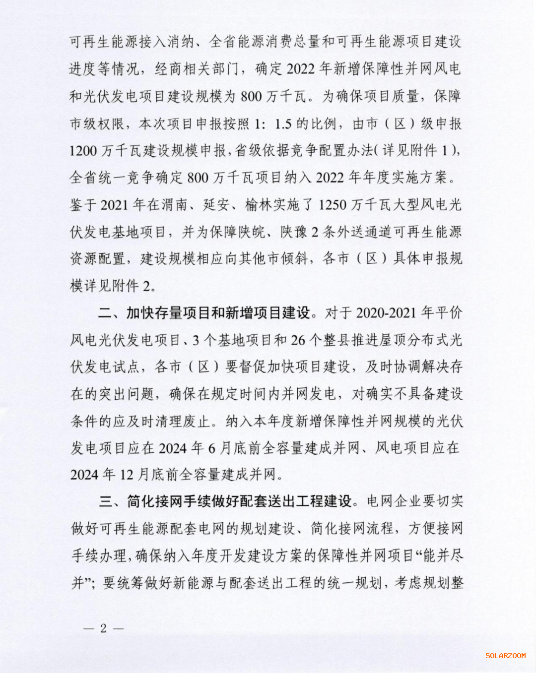 一、2022年保障性并网规模进行竞争性配置。根据国家非水可再生能源电力消纳责任权重占比目标,结合全社会用电量增长、可再生能源接入消纳、全省能源消费总量和可再生能源项目建设进度等情况,经商相关部门,确定2022年新增保障性并网风电和光伏发电项目建设规模为800万千瓦。为确保项目质量,保障市级权限,本次项目申报按照1:1.5的比例,由市(区)级申报1200万千瓦建设规模申报,省级依据竞争配置办法全省统一竞争确定800万千瓦项目纳入2022年年度实施方案。鉴于2021年在渭南、延安、榆林实施了1250万千瓦大型风电光伏发电基地项目,并为保障陕皖、陕豫2条外送通道可再生能源资源配置,建设规模相应向其他市倾斜。