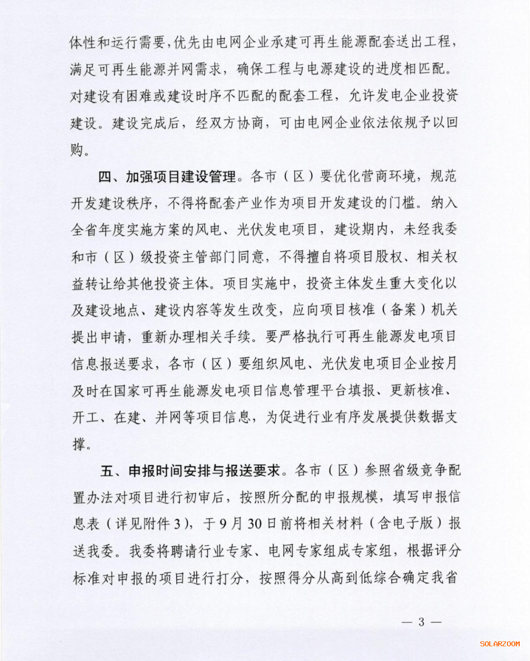 二、加快存量项目和新增项目建设。对于2020-2021年平价风电光伏发电项目、3个基地项目和26个整县推进屋顶分布式光伏发电试点,各市(区)要督促加快项目建设,及时协调解决存在的突出问题,确保在规定时间内并网发电,对确实不具备建设条件的应及时清理废止。纳入本年度新增保障性并网规模的光伏发电项目应在2024年6月底前全容量建成并网、风电项目应在2024年12月底前全容量建成并网。