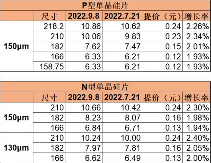 为了覆盖成本压力,TCL中环9月8日上调P型、N型单晶硅片价格,各尺寸硅片较上期报价整体上调0.12-0.24元/片之间。