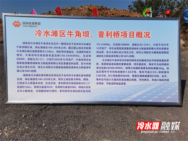 此次开工项目由国家能源集团湖南电力新能源有限公司开发建设,是该公司在湖南省首个独资建设的大型集中式光伏发电项目,包含冷水滩区普利桥100MV光伏项目和90MV牛角坝农光互补一期光伏项目,两个分项目均计划于2022年12月投产。项目建成后,每年可为冷水滩区提供清洁电能约2.45亿千瓦时。按照火电煤耗每度电耗标准煤320克计算,该项目投运后每年可节约标准煤约7.84万吨,每年可减少二氧化碳排放量约2.68万吨、二氧化硫排放量约664吨、氮氧化物排放量约579吨,每年还可减少大量的灰渣及灰尘排放,节约用水,具有良好的经济效益和社会效益。
