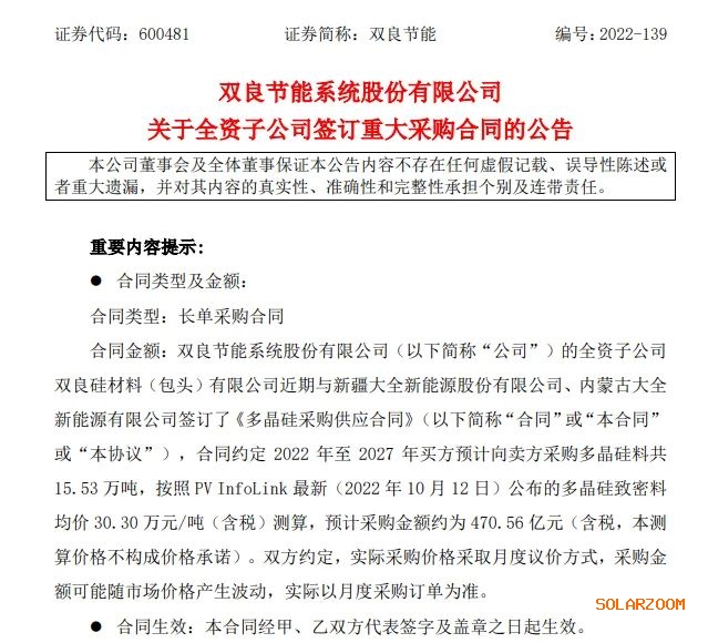 合同约定,从2022年到2027年,双良节能采购多晶硅料15.53万吨,以月度议价的方式进行交易,暂时不能确定金额。以PV InfoLink最新公布的均价测算,预计采购金额约为470.56亿元。