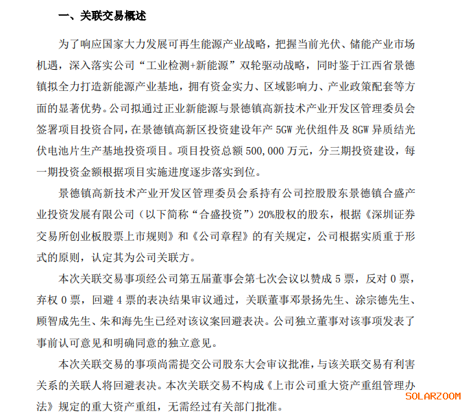 正业科技(300410.SZ)发布公告,该公司于2022年10月23日召开了第五届董事会第七次会议审议通过了《关于与景德镇高新技术产业开发区管理委员会签署项目投资合同暨关联交易的议案》,公司拟通过在景德镇投资成立的控股子公司景德镇正业新能源科技有限公司(暂定名,最终以市场监督管理部门核准的名称为准,以下简称“正业新能源”),与景德镇高新技术产业开发区管理委员会签署项目投资合同,在景德镇高新区投资建设年产5GW光伏组件及8GW异质结光伏电池片生产基地投资项目。