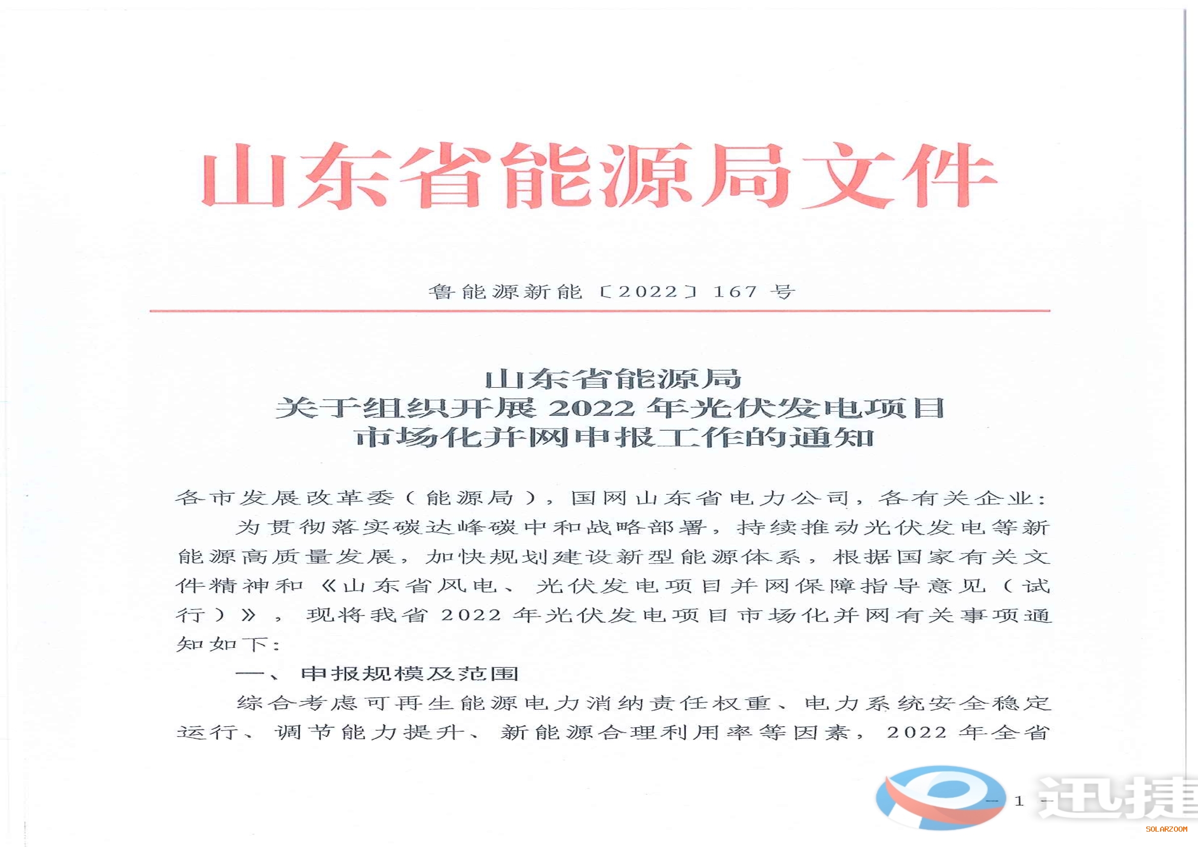 为贯彻落实碳达峰碳中和战略部署,持续推动光伏发电等新能源高质量发展,加快规划建设新型能源体系,根据国家有关文件精神和《山东省风电、光伏发电项目并网保障指导意见(试行)》,现将我省2022年光伏发电项目市场化并网有关事项通知如下: