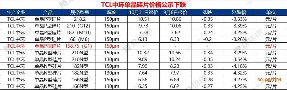 TCL中环最新报价显示,150μm厚度P型218、210、182、166硅片报价分别为10.51元/片、9.73元/片、7.38元/片、6.13元/片,较9月8日上一轮报价分别下调0.35元/片、0.33元/片、0.24元/片和0.2元/片,降幅在3.1%~3.2%。
