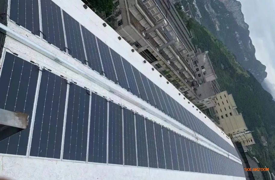 项目安装容量约84.8千瓦,共布置320块IBC轻质柔性组件。组件主要针对屋顶尺寸量身打造,厚度仅为3毫米,较常规单玻组件减重70%以上,不仅充分利用了屋面空间,还减少了屋面载荷压力。组件产品还具有良好的抗紫外线、抗冲击、耐老化性能和防火要求,通过结构胶直接粘贴安装在建筑表面,无风揭风险。除此之外,组件采用效率大于24%的IBC电池,正面无栅线遮挡,让车间厂房披上了美观的科技外套。
