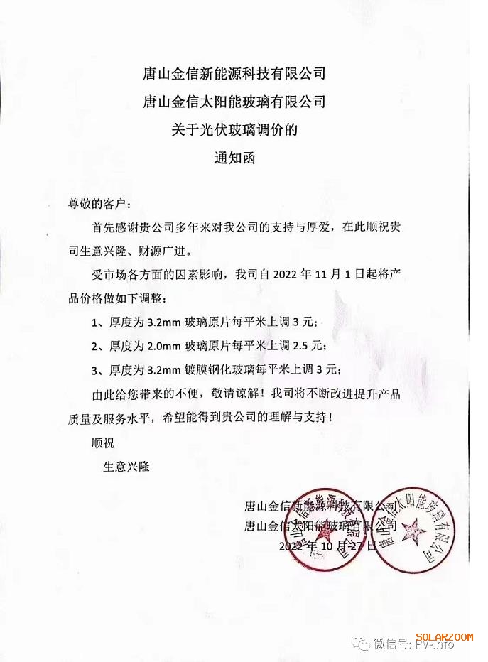 唐山金信太阳能:光伏玻璃价格上调2.5-3元/㎡