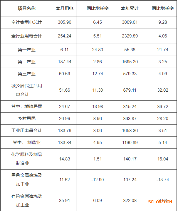 (一)全社会用电量情况。全省全社会用电量305.90亿千瓦时,同比增加6.45%;累计用电量3009.01亿千瓦时,同比增加9.28%。
