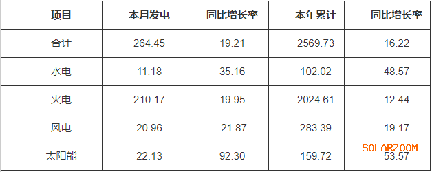 (一)发电量情况。9月份当月,全省发电量264.45亿千瓦时,同比增加19.21%。其中水电11.18亿千瓦时,同比增加35.16%;火电210.17亿千瓦时,同比增加19.95%;风电20.96亿千瓦时,同比减少21.87%;太阳能22.13亿千瓦时,同比增长92.30%。