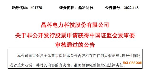 晶科电力科技股份有限公司(简称“晶科科技”,601778.SH)昨晚发布关于非公开发行股票申请获得中国证监会发审委审核通过的公告。2022年11月14日,中国证券监督管理委员会(以下简称“中国证监会”)发行审核委员会对晶科科技非公开发行A股股票的申请进行了审核。根据会议审核结果,公司本次非公开发行A股股票的申请获得审核通过。
