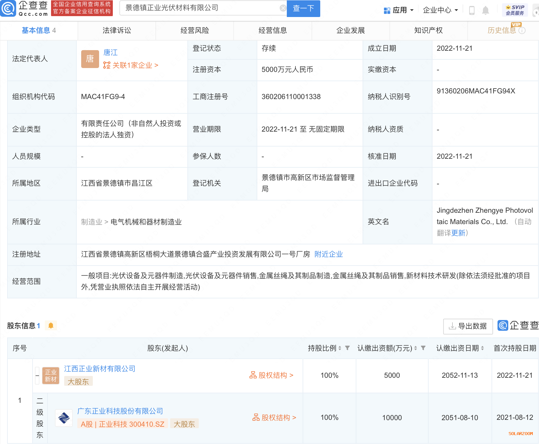 企查查APP显示,近日,景德镇正业光伏材料有限公司成立,法定代表人为唐江,注册资本5000万元人民币,经营范围包含:光伏设备及元器件制造;金属丝绳及其制品制造;新材料技术研发等。企查查股权穿透显示,该公司由正业科技(300410)间接全资控股。