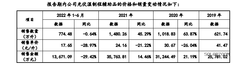实际上,由于竞争加剧,近年来时创能源光伏湿制程辅助品的价格不断走低。2020年、2021年和2022年上半年,该产品的销售单价分别下降了26.04%、21.22%和28.97%。据时创能源招股书披露,2022年上半年与2019年相比,公司光伏湿制程辅助品单价从41.47元/升下降至17.65元/升,降幅为57.43%,导致毛利率下降19.98个百分点。