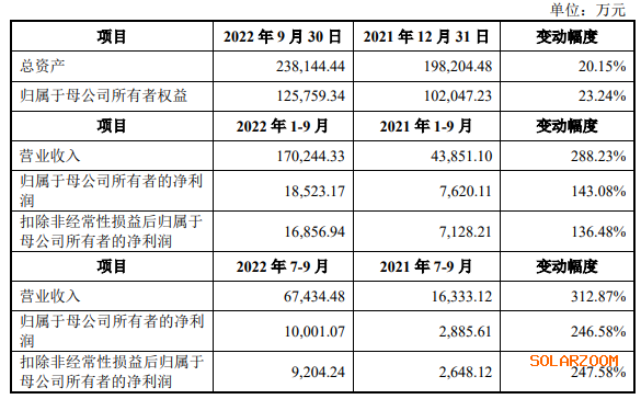 凭借光伏电池业务的增长,2022年前三季度,时创能源收入达到17.02亿元,归母净利润达到1.85亿元,远远超过去年全年水平。而2019年~2021年,时创能源营业收入分别为3.45亿元、4.38亿元、7.12亿元,同期归母净利润分别为1.06亿元、1.42亿元和0.91亿元。