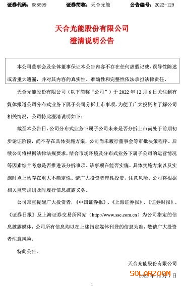 天合光能在公告中称,公司于2022年12月6日关注到有媒体报道公司分布式业务下属子公司分拆上市事项,为便于广大投资者了解公司相关情况,公司特此澄清说明如下: