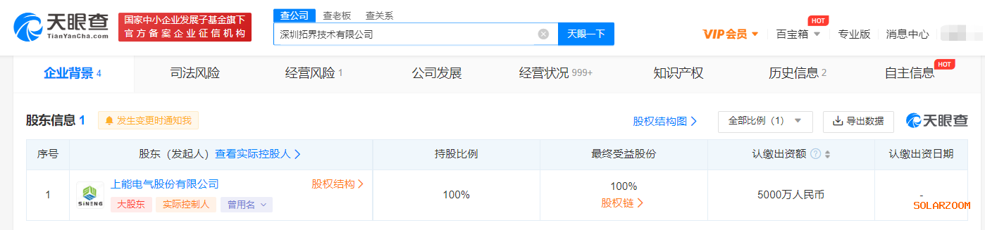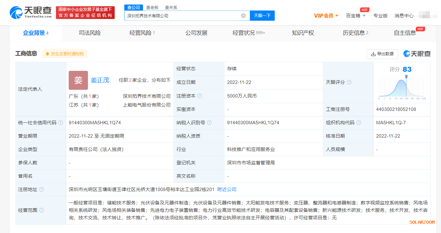天眼查App显示,近日,深圳拓界技术有限公司成立,法定代表人为姜正茂,注册资本5000万人民币,经营范围包括储能技术服务;光伏设备及元器件制造;光伏设备及元器件销售;太阳能发电技术服务等。股东信息显示,该公司由上能电气股份有限公司全资控股。