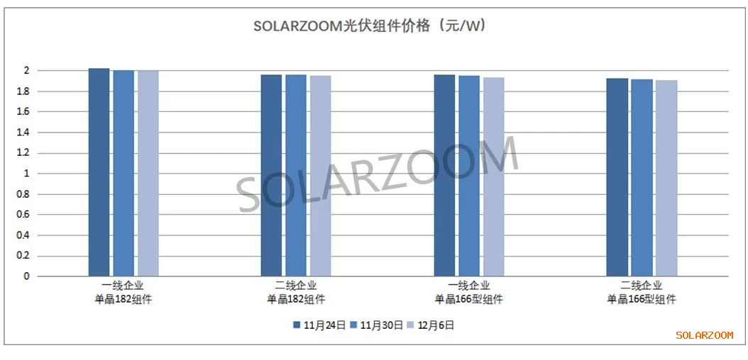 当前国内年底项目抢装仍有部分需求仍在,组件现货市场有一定支撑;但随着12月中旬之后国内年底抢装项目进入尾声,海外双旦节日来临,而部分海外地区前期所屯组件库存也需一定时间消耗的情况下,国内组件需求预计将在12月中旬之后趋弱,同时在组件上游各环节以及辅材价格开始下行时,国内组件厂商整体12月份的排产规划略显谨慎,环比上月不少组件厂商下调了本月生产计划,部分厂商的外放代工订单也是有所收缩。价格方面,在上游主产业链各环节价格下跌以及部分辅材价格下跌的情况下,组件端新订单的组件价格也是出现松动,当前国内主流组件价格在1.92-1.97元/W区间。N型组件方面,随着N型产能市场的投放,N型组件的订单成交逐步增加,当前国内N型组件价格在2-2.1元/W区间。