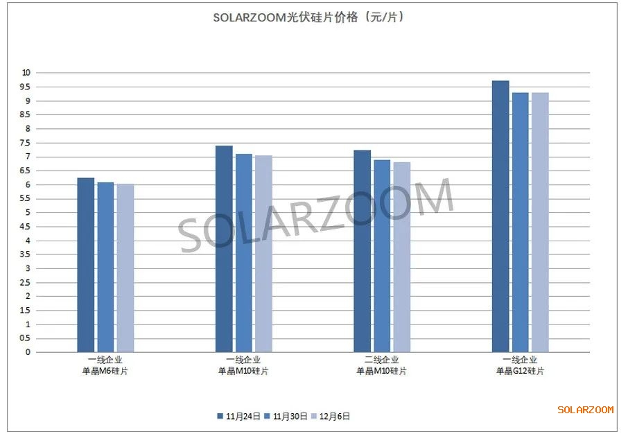 本周国内单晶硅片实际成交价格继续下跌,市场上硅片企业仍多以出货去库存为主。在上月下旬两家硅片龙头企业出台12月硅片价格后,市场上主流实际成交的单晶硅片价格仍未能够稳住,当前仍在继续下跌中,本周国内单晶M10 150μm正A硅片实际成交价格来至6.8-7元/片,单晶G12 150正A硅片价格来至8.9-9.3元/片,市场上更低的价格也有成交,而其他类型的硅片价格也已是较为混乱。进入12月下游终端需求也将有所转弱,同时上游硅料虽开始下跌,但实际成交价格仍未明朗的情况下,国内硅片厂商对于开工也基本持谨慎态度。短期内硅片供过于求的局势仍将有一定持续,同时在上游硅料环节价格下跌的情况下,硅片价格恐将继续有所下滑。N型硅片方面,相对P型硅片市场N型硅片相对平稳,150μm厚度N型210、182硅片最新报价分别为9.86元/片和7.54元/片。