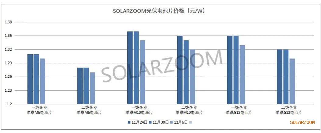 在上游硅片价格持续下跌同时下游终端需求转弱逐步传导至电池环节的情况下,本周国内电池片实际成交价格出现下跌。临近年末,国内外终端需求预计将在本月中旬之后开始趋弱,相应的组件端对电池采购的观望情绪渐起;此外近期市场上单晶大尺寸电池供给也是有所增加(上游硅片下跌及出货不畅的情况下并不少硅片直接加工刷成了电池片;龙头电池企业近期增加了市场投放量)的情况下,国内单晶电池供需相对平衡,国内单晶电池片价格开始明显出现下跌,本周单晶M10大尺寸电池成交价格来至1.32-1.33元/W区间,且市场开始有1.3-1.31元/W价格的议价出现。其他尺寸电池方面,单晶G12电池价格也是随之下调,主流价格来至1.29-1.32元/W区间。对于后期单晶电池价格走势,在上游环节硅片价格仍在继续下跌同时终端需求仍有趋弱的形势下,国内单晶电池价格仍将会继续下降。